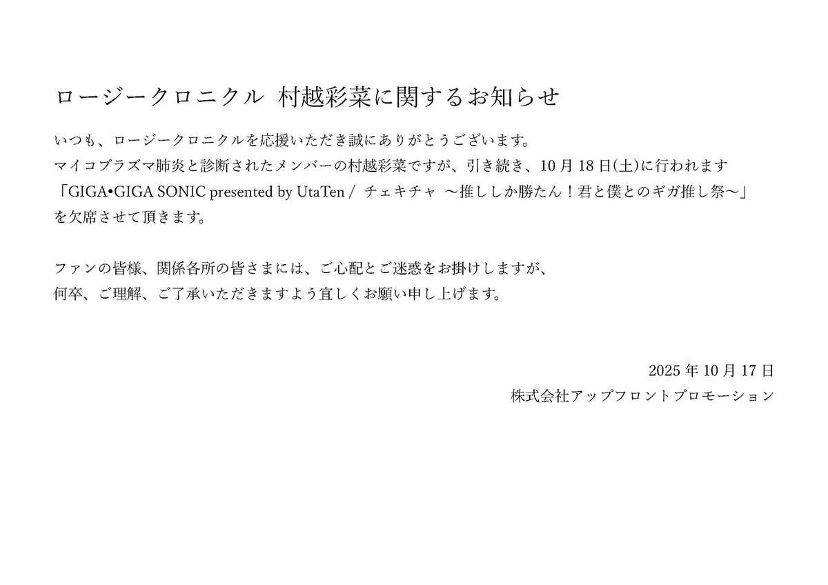 【ロージークロニクル 村越彩菜に関するお知らせ】